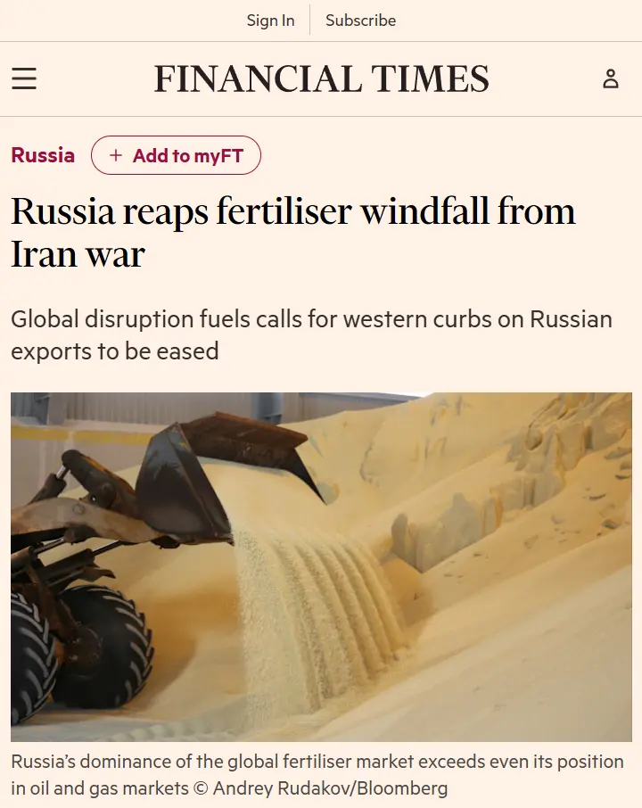 - Rusko těží z prudkého nárůstu cen hnojiv, který je způsoben válkou mezi USA a Izraelem proti Íránu.